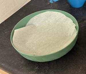 Line baking pan or shallow bowl with butter, foil or parchment paper (whatever you have available)